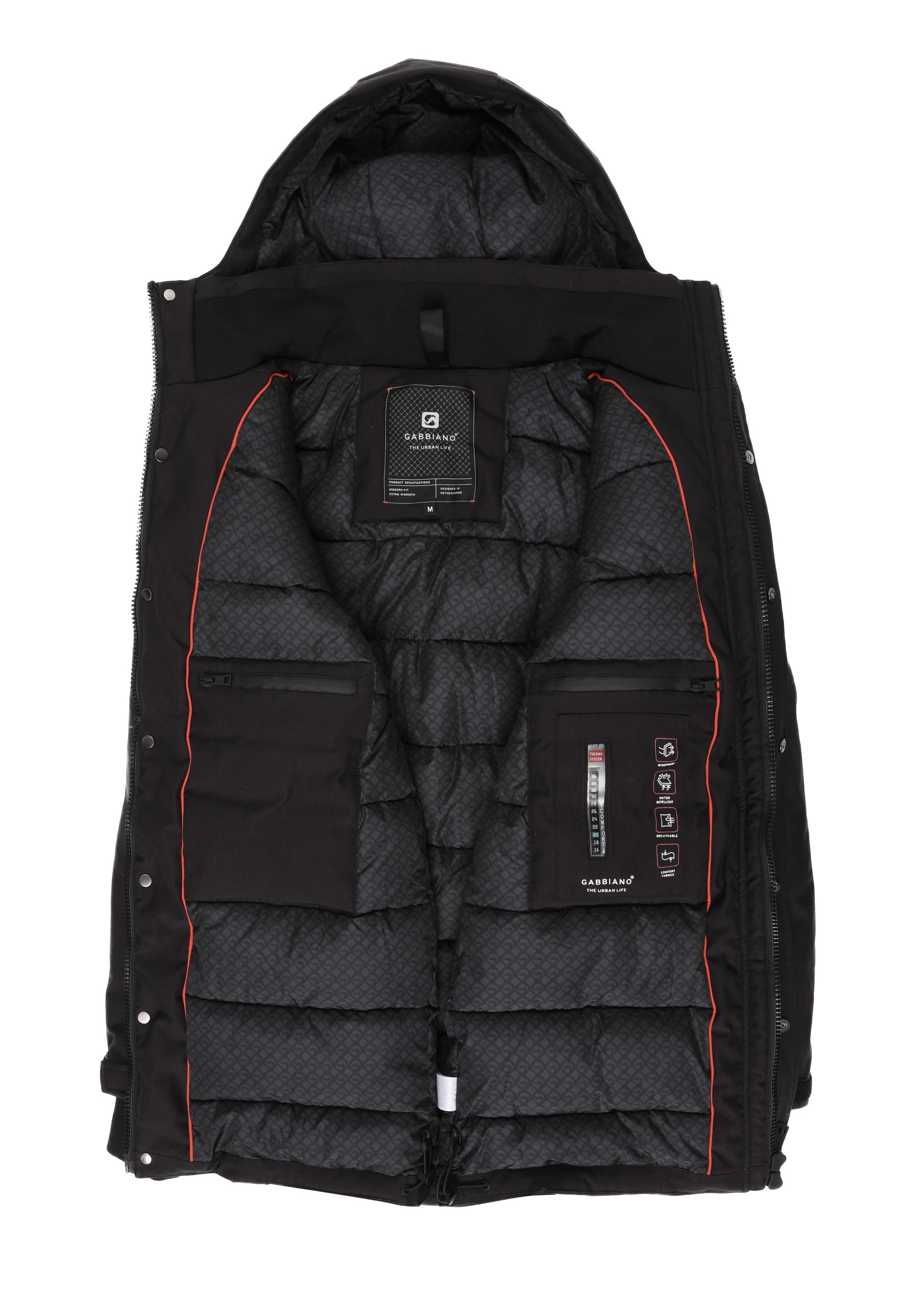 Aan de binnenzijde vind je twee ritszakken – één aan elke kant – ideaal voor het veilig opbergen van je telefoon, sleutels of andere essentials. Bovendien is de jas uitgerust met een geïntegreerd temperatuurmeting-gadget aan de binnenkant, waarmee je eenvoudig je lichaamstemperatuur kunt controleren.
