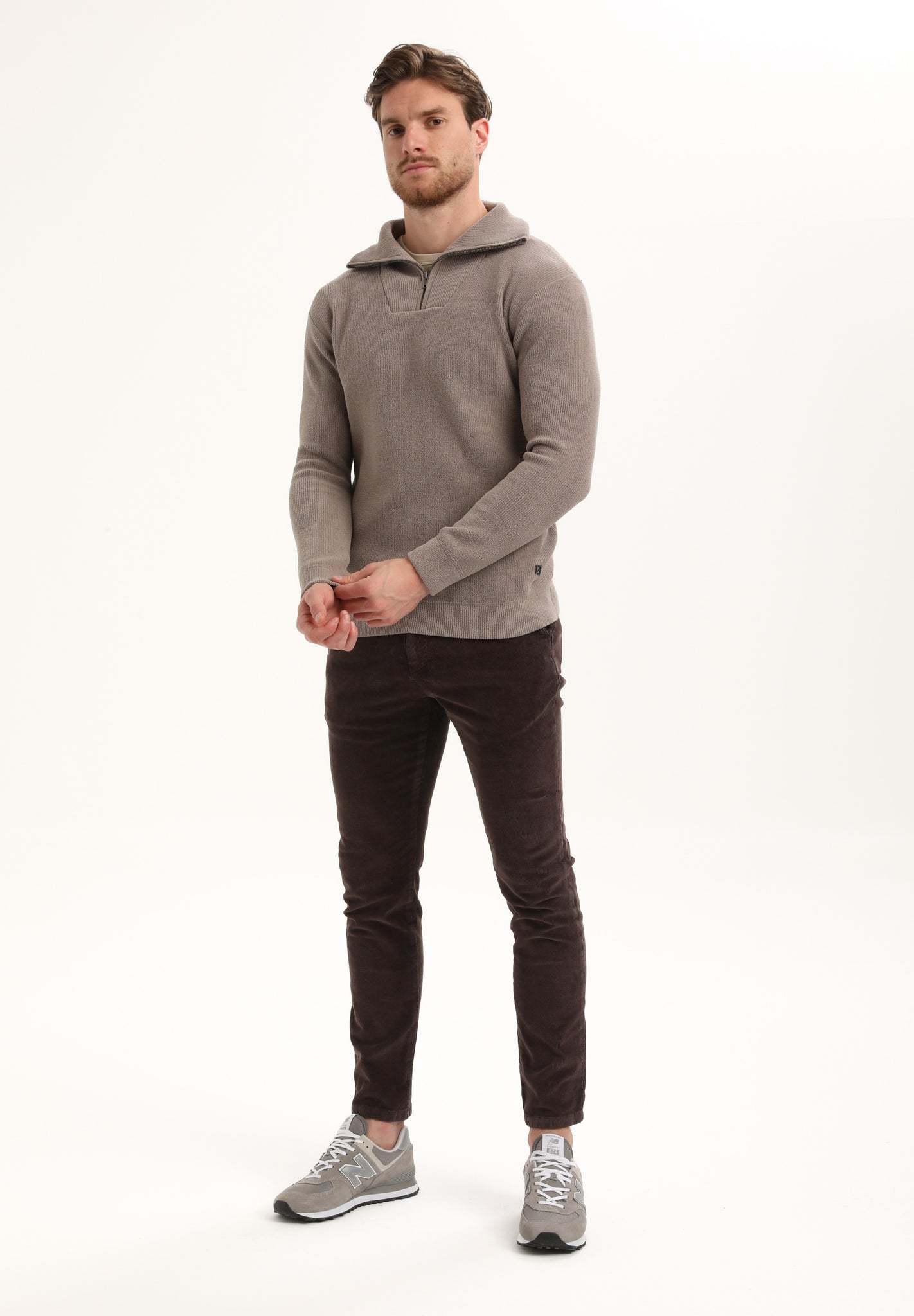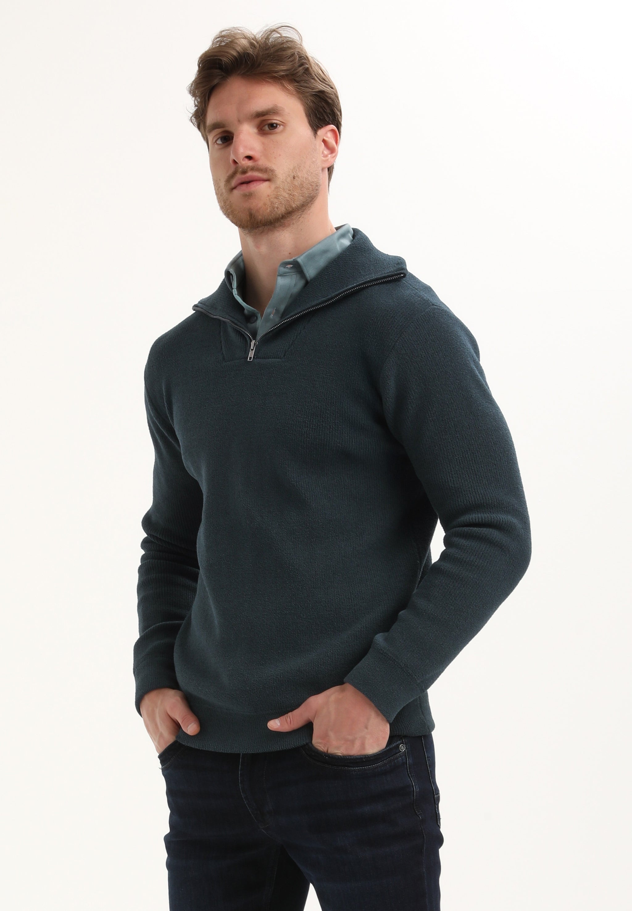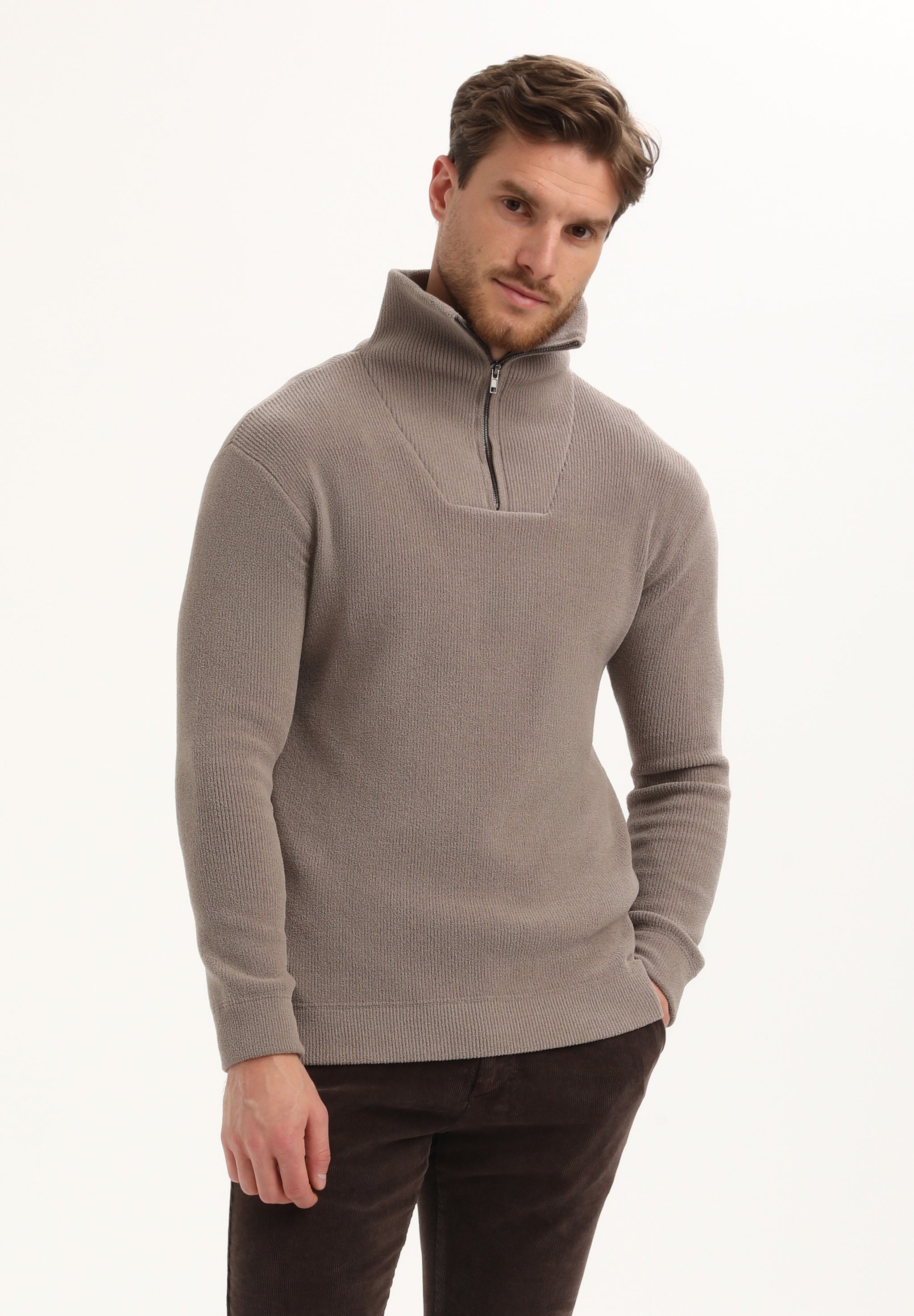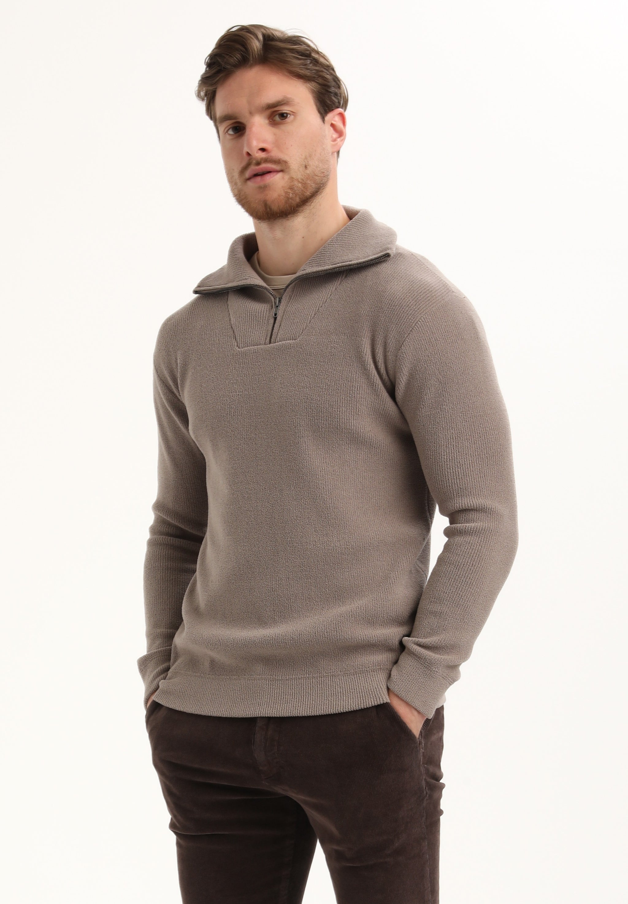 De zachte stof heeft een rijke, matte uitstraling en voelt prettig aan op de huid. De rits is afgewerkt met een herkenbaar maar subtiel logo, wat zorgt voor een verfijnde look. Combineer met een nette jeans voor een moderne en verzorgde outfit.