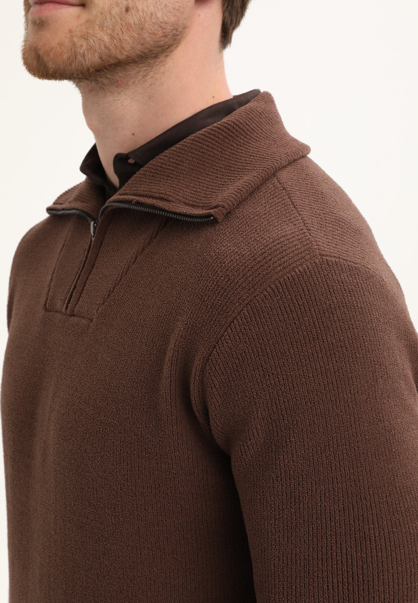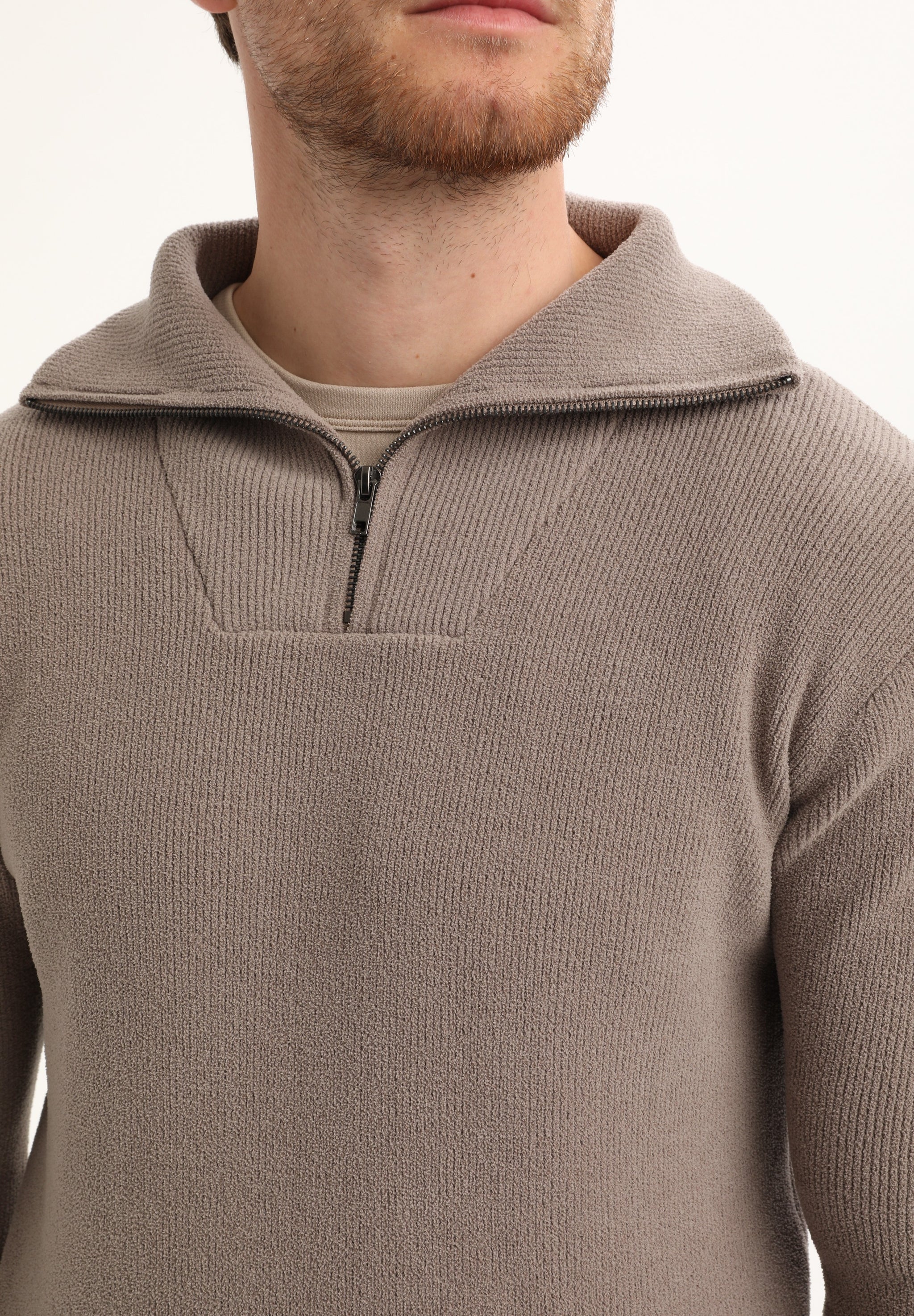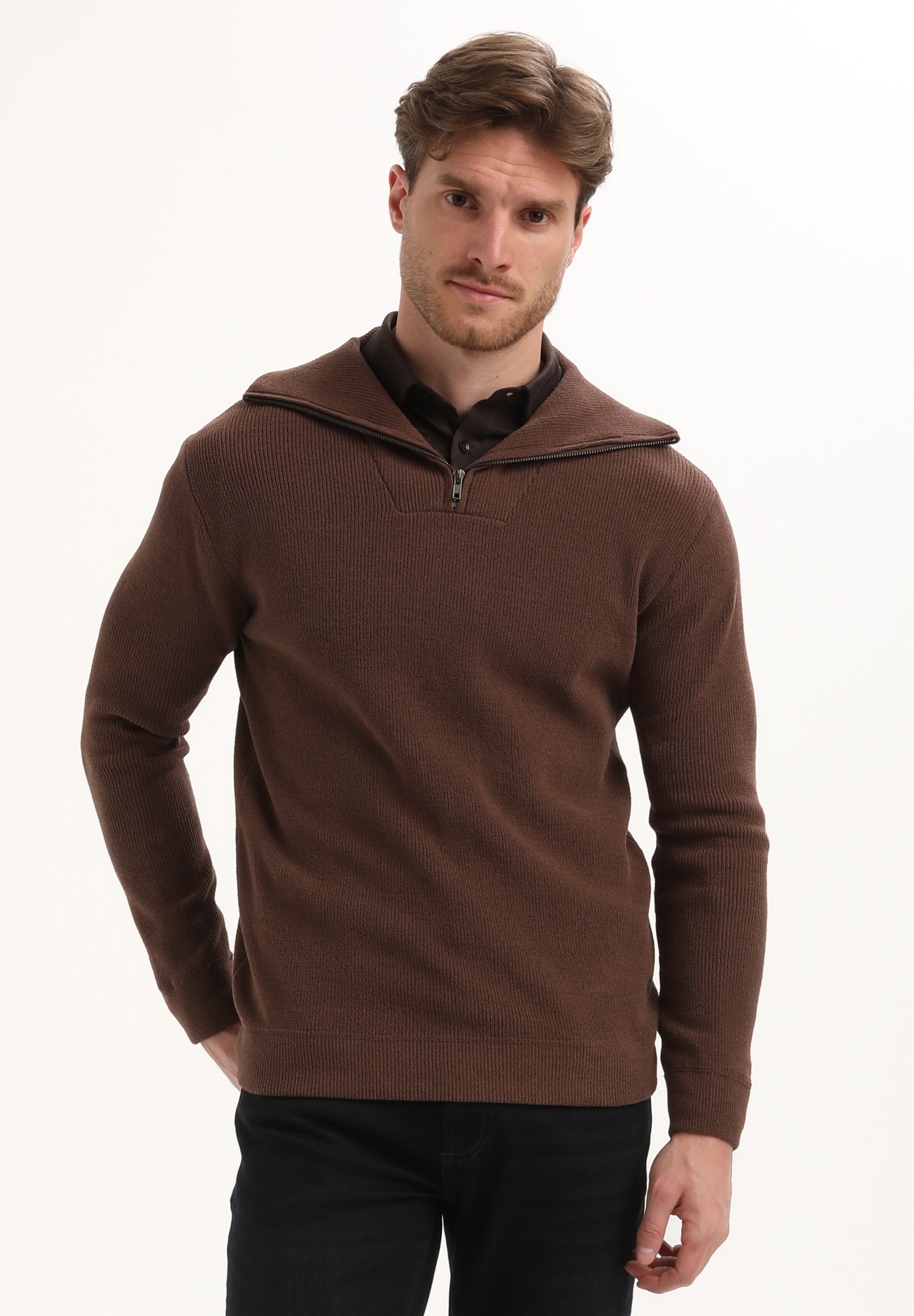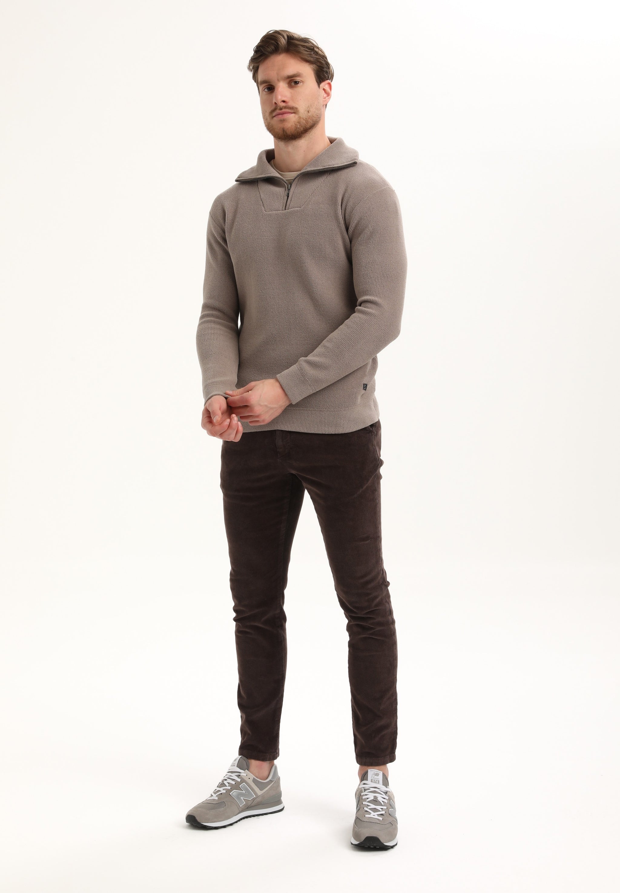 De zachte stof heeft een rijke, matte uitstraling en voelt prettig aan op de huid. De rits is afgewerkt met een herkenbaar maar subtiel logo, wat zorgt voor een verfijnde look. Combineer met een nette jeans voor een moderne en verzorgde outfit.
